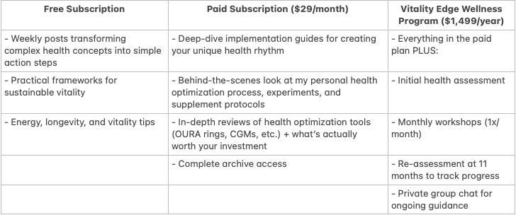 Weekly posts that simplify complex health concepts into actionable stepsâperfect for starting your vitality journey.Monthly Plan ($29/month):